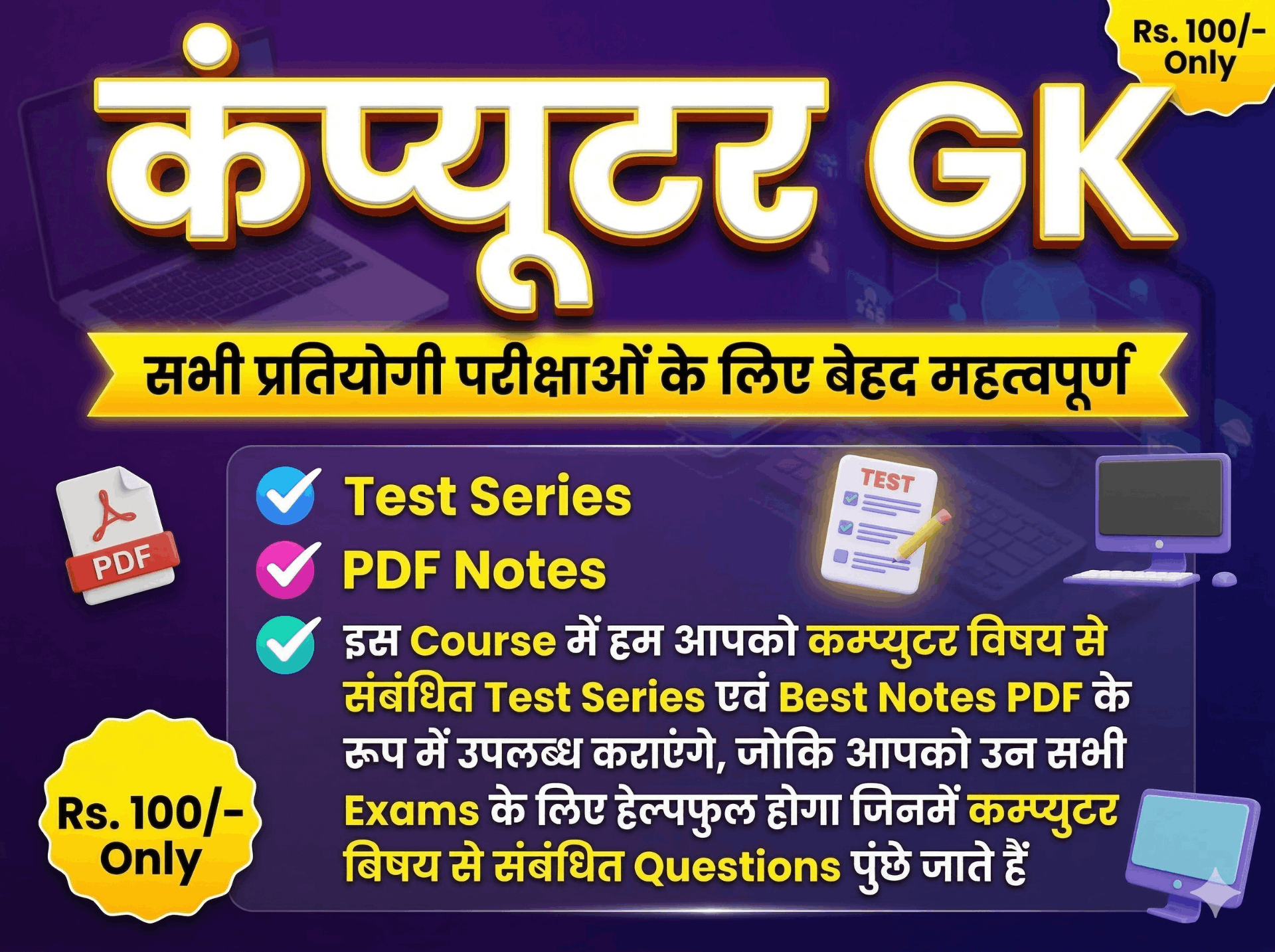 ЁЯФе рдЗрд╕ Course рдореЗрдВ рдЖрдкрдХреЛ рдорд┐рд▓реЗрдЧрд╛ ЁЯТп тЬЕя╕П 50+ Online Test Series тАУ рдкреНрд░рддреНрдпреЗрдХ рдкреНрд░рд╢реНрди рдХреЗ рд╕рд╛рде рд╡рд┐рд╕реНрддреГрдд Solutions ЁЯУЭ тЬЕя╕П Computer GK рдХреЗ рд╕рдмрд╕реЗ Best PDF Notes ЁЯУЪ тЬЕя╕П рд╕рднреА рдкреНрд░рд╢реНрдиреЛрдВ рдХреЗ Detail Solutions тАУ рддрд╛рдХрд┐ рдЖрдк рдЕрдкрдиреА рдХрдордЬреЛрд░рд┐рдпреЛрдВ рдХреЛ рд╕реБрдзрд╛рд░ рд╕рдХреЗрдВ ЁЯОп тЬЕя╕П Performance Analysis рдХреА рд╕реБрд╡рд┐рдзрд╛ тАУ рдЕрдкрдиреА рддреИрдпрд╛рд░реА рдХрд╛ рд╕рд╣реА рдЖрдХрд▓рди рдХрд░рдиреЗ рдХреЗ рд▓рд┐рдП ЁЯУК ЁЯУМ рдпрд╣ Course рдХрд┐рди рдкрд░реАрдХреНрд╖рд╛рдУрдВ рдХреЗ рд▓рд┐рдП рдЙрдкрдпреЛрдЧреА рд╣реИ? ЁЯСЙ рдпрд╣ Course SSC, RRB, Bank Exams рдПрд╡рдВ рд╕рднреА рд░рд╛рдЬреНрдпреЛрдВ рдХреА рдЙрди рдкреНрд░рддрд┐рдпреЛрдЧреА рдкрд░реАрдХреНрд╖рд╛рдУрдВ рдХреЗ рд▓рд┐рдП рдЙрдкрдпреЛрдЧреА рд╣реИ рдЬрд┐рдирдореЗрдВ Computer GK рд╕реЗ рд╕рдВрдмрдВрдзрд┐рдд рдкреНрд░рд╢реНрди рдкреВрдЫреЗ рдЬрд╛рддреЗ рд╣реИрдВ ЁЯТ╗ ЁЯФе Key Features: рдЗрд╕ Course рдореЗрдВ Regularly New Tests рдФрд░ Notes PDFs Update рдХрд┐рдП рдЬрд╛рдПрдВрдЧреЗ ЁЯУЖ Exam-oriented рдХрдВрдЯреЗрдВрдЯ рдЬреЛ Selection Chances рдХреЛ рдХрдИ рдЧреБрдирд╛ рдмрдврд╝рд╛ рджреЗрдЧрд╛ ЁЯЪА ЁЯСЙ рдЖрдЬ рд╣реА рдЗрд╕ Course рдХреЛ рдЦрд░реАрджреЗрдВ рдФрд░ рдЕрдкрдиреА рддреИрдпрд╛рд░реА рдХреЛ рдЕрдЧрд▓реЗ рд╕реНрддрд░ рдкрд░ рд▓реЗ рдЬрд╛рдПрдВ! ЁЯТк рдЖрдк рд╕рднреА рдХреЛ рдирд┐рддрд┐рди рдЧреБрдкреНрддрд╛ рдХреА рдУрд░ рд╕реЗ рдвреЗрд░ рд╕рд╛рд░реА рд╢реБрднрдХрд╛рдордирд╛рдПрдБ! ЁЯЩПЁЯСН ЁЯМР Language: рд╣рд┐рдиреНрджреА ЁЯЗоЁЯЗ│ ЁЯУЖ Validity: 1 Year тП│