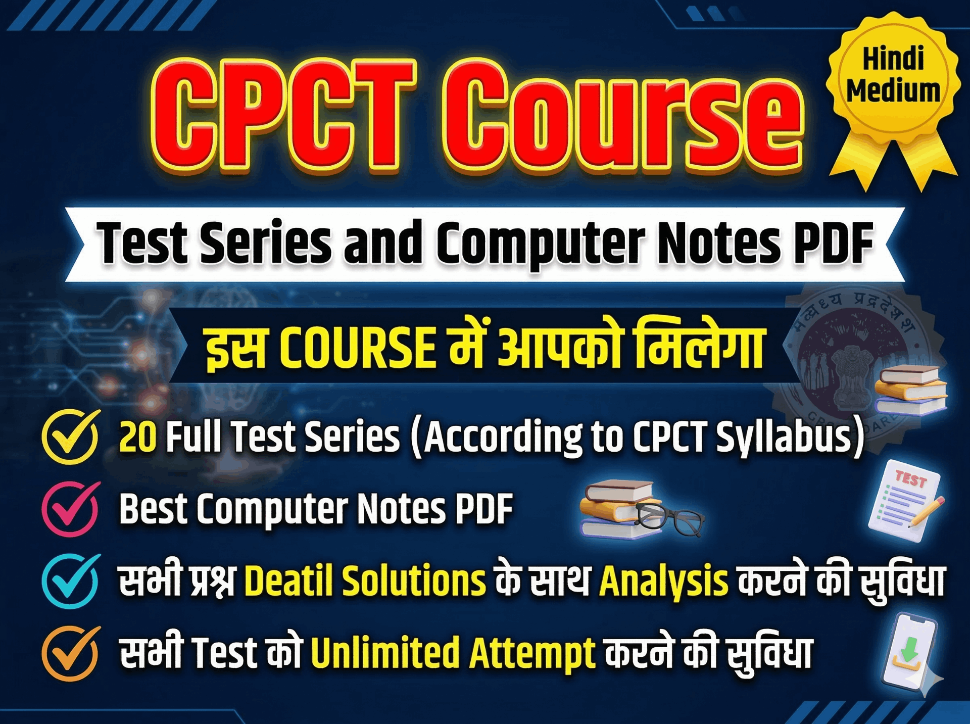 ЁЯФе CPCT Course 2026 - 20 Full Test Series and Computer Notes ЁЯФе рдХреЗ рдЗрд╕ Course рдореЗрдВ рдЖрдкрдХреЛ рдорд┐рд▓реЗрдЧрд╛ЁЯТп тЬЕя╕П 20 Full Test Series (According to CPCT Syllabus) тЬЕя╕П Best Computer Notes PDF тЬЕя╕П Previous Year CPCT Paper тЬЕя╕П рд╕рднреА рдкреНрд░рд╢реНрди Deatil Solutions рдХреЗ рд╕рд╛рде тЬЕя╕П Analysis рдХрд░рдиреЗ рдХреА рд╕реБрд╡рд┐рдзрд╛ тЬЕя╕П рд╕рднреА Test рдХреЛ Unlimited Attempt рдХрд░рдиреЗ рдХреА рд╕реБрд╡рд┐рдзрд╛ ЁЯТердмрд┐рд╢реЗрд╖ FocusЁЯТе рдЪреВрдБрдХрд┐ CPCT Exams рдореЗрдВ Computer рд╕реЗ рд╕рдВрдмрдиреНрдзрд┐рдд 52 Questions рдЖрддреЗ рд╣реИрдВ рдЗрд╕реАрд▓рд┐рдП рдХрдореНрдкреНрдпреБрдЯрд░ рдХреЗ Notes рд╡ Test рдкрд░ рдмрд┐рд╢реЗрд╖ рдзреНрдпрд╛рди рджрд┐рдпрд╛ рдЬрд╛рдПрдЧрд╛ , рддрд╛рдХрд┐ рдЖрдк 100 рдкреНрд░рддрд┐рд╢рдд рдЕрдкрдиреЗ рд▓рдХреНрд╖реНрдп рдХреЛ рдкреНрд░рд╛рдкреНрдд рдХрд░ рдкрд╛рдУ ЁЯСЙ рдЗрд╕ Course рдореЗрдВ Regular New Test рд╡ Notes PDF рдХреЛ Update рдХрд┐рдпрд╛ рдЬрд╛рдПрдЧрд╛ рдЖрдЬ рд╣реА рдЦрд░реАрджреЗрдВ рдФрд░ рдЕрдкрдиреА рддреИрдпрд╛рд░реА рдХреЛ рдмреЗрд╣рддрд░ рдмрдирд╛рдП |ЁЯСЗ рдЖрдк рд╕рднреА рдХреЛ рдирд┐рддрд┐рди рдЧреБрдкреНрддрд╛ рдХреА рддрд░рдл рд╕реЗ All The BestЁЯСН Medium - рд╣рд┐рдиреНрджреА valadity - 1 Year